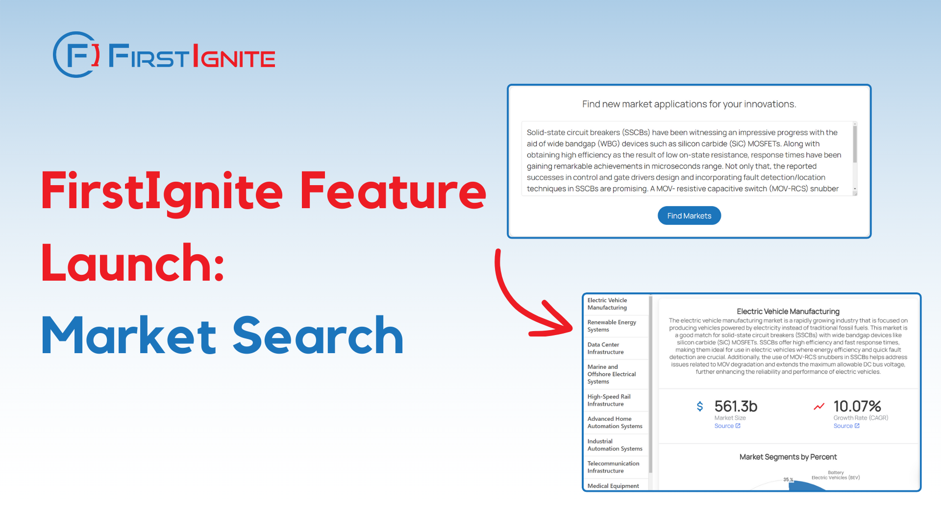 Firstignite is an AI software that efficiently increases outbound communication about your team’s projects, educating potential collaborators and facilitating collaboration. Our new market search feature allows your team to identify market applications, review market reports (with verifiable sources), and review incumbents and upstarts in each market.